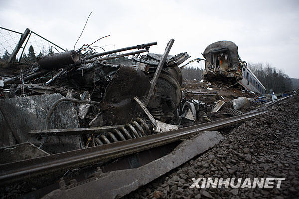 11月28日在俄羅斯特維爾州博洛戈耶市拍攝的俄客運列車脫軌事故現場。新華社記者魯金博攝