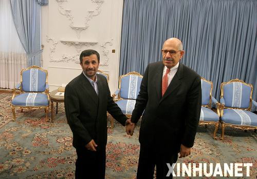 資料圖片:10月4日,在伊朗首都德黑蘭,伊朗總統艾哈邁迪-內賈德(左)會見國際原子能機構總干事巴拉迪。巴拉迪3日傍晚抵達伊朗進行訪問,并將在訪問期間著重就伊朗核問題與伊朗官員進行對話。 新華社發 (哈拉比薩斯攝)