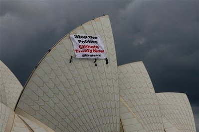 據(jù)報道,在哥本哈根召開的氣候峰會上,發(fā)達(dá)國家和發(fā)展中國家兩大陣營之間仍在僵持,各界對峰會結(jié)果的悲觀情緒彌漫會場。15日,5名綠色和平組織成員抓著繩索爬上了悉尼歌劇院,并拉開一個100平米大的條幅,上面寫著“不要再玩政治——立刻達(dá)成氣候協(xié)議”。事后,這5人被警方逮捕。