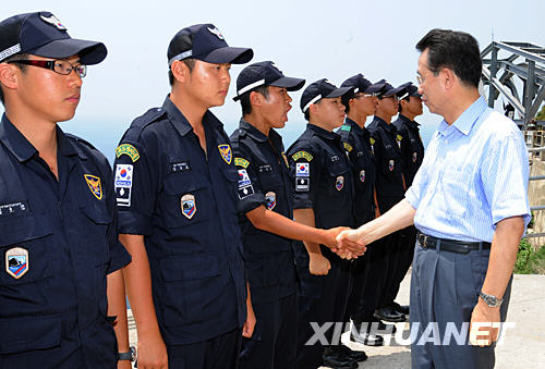 資料圖片:2008年7月29日,韓國總理韓升洙(右)在位于韓國東部海域的獨島(日本稱“竹島”)上看望守島的警務(wù)人員。