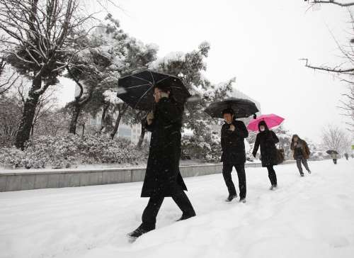 行人在首爾被大雪覆蓋的馬路上艱難地行走