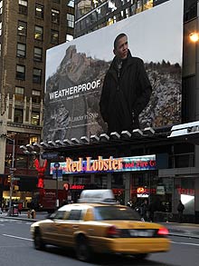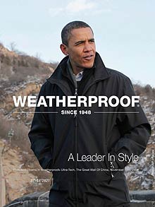 5日,紐約時代廣場一個巨幅Weatherproof廣告牌吸引了許多路人駐足觀看。廣告用了一張奧巴馬出訪中國時在長城上的留影。圖片下面有一行宣傳語“領袖的風范”。