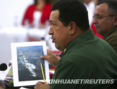 1月8日,在委內瑞拉首都加拉加斯,委內瑞拉總統查韋斯在總統府出席部長會議時展示一張飛機圖片。新華社/路透