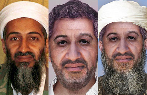 FBI公布拉登最新數(shù)碼合成照片,左側(cè)為資料照片,中間和右側(cè)為合成照片。