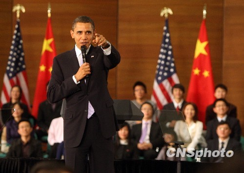 11月16日,正在中國進行國事訪問的美國總統奧巴馬,在上海就中美關系的未來向中國青年發表演講并回答提問。 中新社發 湯彥俊 攝