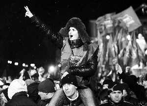 5日,烏克蘭首都基輔,一名亞努科維奇的支持者作勝利手勢。烏克蘭將于7日進行總統(tǒng)大選第二輪投票。