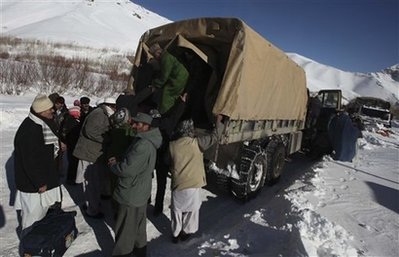 被大雪圍困的阿富汗人9日成功獲救進入軍車。