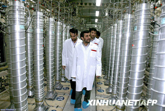 這張拍攝于2008年4月8日的資料照片顯示的是伊朗總統艾哈邁迪-內賈德視察納坦茲核設施。2月9日,伊朗在納坦茲核設施開始生產純度為20%的濃縮鈾。 新華社/法新