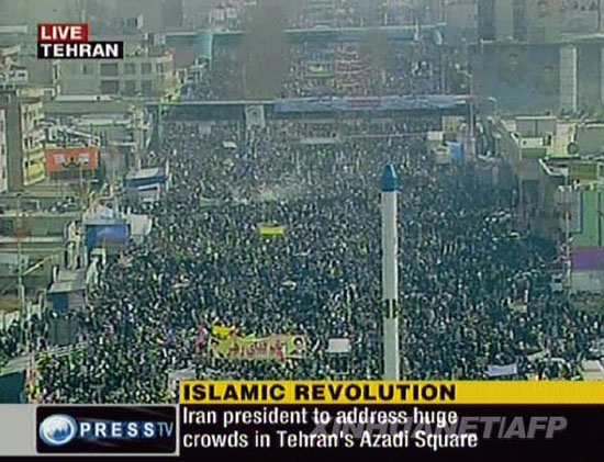 這張2月11日伊朗電視臺的電視截圖顯示,數十萬伊朗民眾在德黑蘭的自由廣場集會,慶祝伊斯蘭革命勝利31周年。1979年2月1日,領導伊朗伊斯蘭革命的霍梅尼結束流亡生涯返回伊朗,巴列維王朝政權在2月11日倒臺,伊朗伊斯蘭革命取得勝利。新華社/法新
