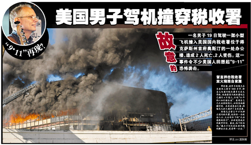 一名男子18日駕駛一架小型飛機(jī)撞入美國(guó)國(guó)內(nèi)稅收署位于得克薩斯州首府奧斯汀的一處辦公樓,造成2人死亡、2人受傷。這一事件令不少美國(guó)人回想起“9·11”恐怖襲擊。