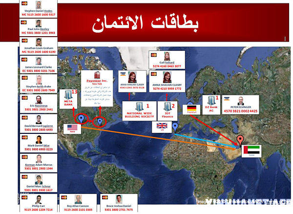 這張2月24日阿聯(lián)酋迪拜警方公布的照片顯示的是暗殺馬巴胡赫的嫌疑人信用卡使用線路圖。迪拜警方24日發(fā)表聲明說,涉嫌暗殺巴勒斯坦伊斯蘭抵抗運(yùn)動(dòng)(哈馬斯)領(lǐng)導(dǎo)人馬哈茂德·馬巴胡赫的嫌疑人數(shù)已升至28人,其中包括先前落網(wǎng)的被關(guān)押在迪拜的2名巴勒斯坦人。新華社/法新