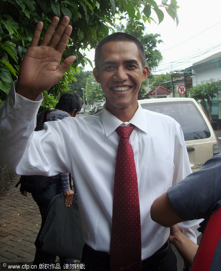 據(jù)報道,現(xiàn)年34歲的伊爾哈姆·阿納斯是印尼雅加達市的一名攝影師和兩個孩子的父親,在印尼的西爪哇島萬隆市出生并長大。不可思議的是,他的相貌與美國當選總統(tǒng)奧巴馬相貌幾乎一模一樣,乍一看去,阿納斯長得就仿佛是奧巴馬的雙胞胎兄弟似的。自從2008年11月奧巴馬成為當選總統(tǒng)之后,阿納斯的照片就通過因特網(wǎng)傳遍了世界,而他也迅速成為網(wǎng)絡(luò)紅人。照片中,阿納斯身穿黑色西裝站在幾名印尼年輕人中間,臉上露出奧巴馬的招牌微笑,就仿佛是真正的奧巴馬在訪問印尼期間與粉絲合影一般!