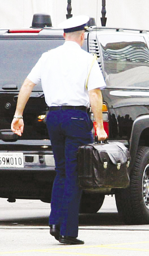 據《揚子晚報》報道,俄羅斯媒體28日報道稱,美國總統奧巴馬2009年1月20日宣誓就任美國總統時,他也從前任總統小布什那兒繼承了一只黑色手提箱,這只手提箱就是廣為流傳的“核按鈕手提箱”,箱子里存放著啟動美國核武器的密碼。