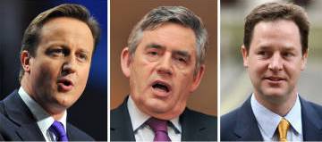 英國三大政黨黨首:保守黨卡梅倫、工黨布朗、自民黨克萊格(從左到右)