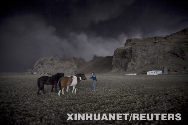 4月17日,在冰島一處農(nóng)場,農(nóng)夫索拉林·奧拉夫松試圖安撫他的馬匹免受夾雜火山灰的烏云驚擾。冰島南部火山日前再次噴發(fā)所產(chǎn)生的大量火山煙塵嚴(yán)重影響了歐洲地區(qū)的空中交通,導(dǎo)致多個國家機(jī)場關(guān)閉,大量航班被取消。新華社/路透