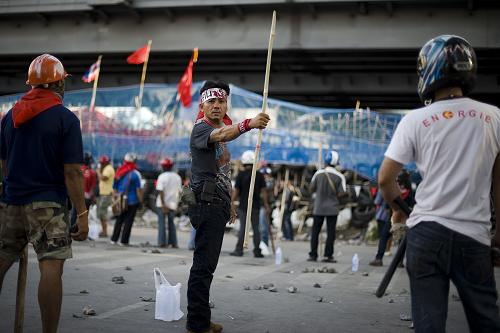 4月26日,一名“紅衫軍”成員手握削尖的竹竿站在泰國首都曼谷“紅衫軍”的營地里。泰國部分府的反政府“紅衫軍”當天采取行動,阻止警察進入曼谷參加政府計劃驅散“紅衫軍”集會示威者的行動。新華社/法新