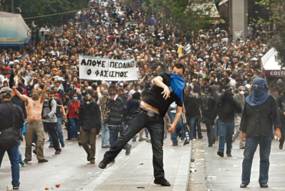 希臘5日爆發(fā)全國性罷工及10萬人大示威,抗議政府的財政緊縮政策。據香港《文匯報》報道,在首都雅典約60人試圖沖破警方的封鎖線沖擊國會,警方揮動警棍還擊,又施放催淚氣體。有銀行遭投擲燃燒彈放火焚燒,最少3名職員死亡,5人受傷送院,消防員疏散約20人。警方總動員應付局面,并宣布首都進入戒備狀態(tài)。