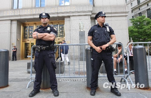 5月4日,紐約曼哈頓區(qū)聯(lián)邦法庭外,兩名警察嚴(yán)陣以待。據(jù)美國媒體報(bào)道,企圖制造5月1日美國紐約時(shí)報(bào)廣場(chǎng)汽車炸彈案的嫌犯費(fèi)薩爾·沙赫扎德,將于當(dāng)天在該法庭受審。據(jù)了解,費(fèi)薩爾·沙赫扎德將被控以恐怖主義和企圖使用大規(guī)模殺傷性武器等罪名。但有最新消息稱,由于嫌犯已經(jīng)對(duì)所犯罪行供認(rèn)不諱,并積極配合警方調(diào)查,4日的庭審可能將延期舉行。 中新社發(fā) 魏晞 攝