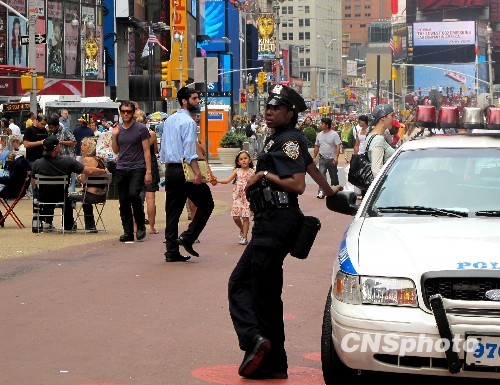 5月2日,紐約時(shí)報(bào)廣場(chǎng)依舊人流如織,絲毫不受1日晚間那一沒被引爆的汽車炸彈事件影響。但2日時(shí)報(bào)廣場(chǎng)警力增多,圖為女警在廣場(chǎng)巡視。1日晚間,一輛停于時(shí)報(bào)廣場(chǎng)的日產(chǎn)車冒煙并發(fā)出輕微爆破聲,附近的小販報(bào)警后,紐約警察從車內(nèi)清理出大量爆炸物,幸而沒引發(fā)更大的災(zāi)難,紐約市長彭博稱“躲過一劫”。 中新社發(fā) 孫宇挺 攝