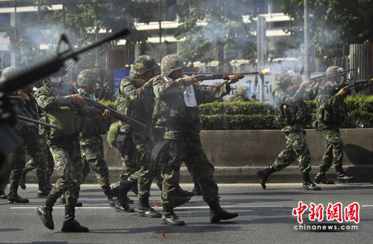 美聯社在報道中表示,泰國軍隊向示威人群開槍、發射催淚彈,并向紅衫軍集會地點推進。
