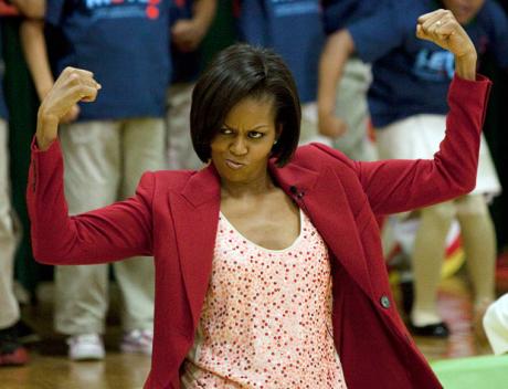 奧巴馬夫人向孩子們秀肌肉。(資料圖)