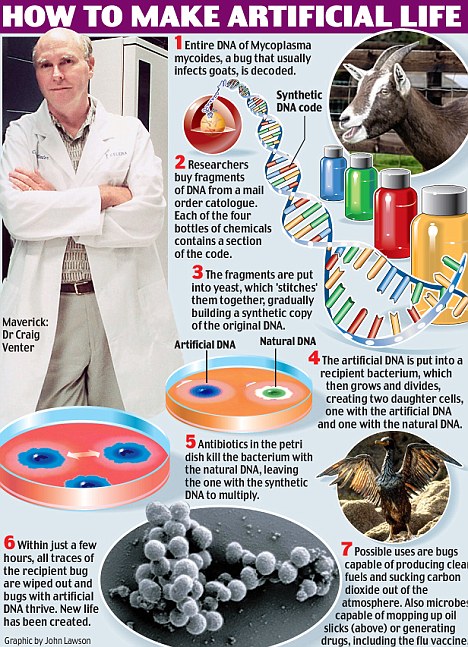 美國(guó)J·克雷格·文特爾研究所的研究人員在最新一期美國(guó)《科學(xué)》雜志上報(bào)告說(shuō),他們?nèi)斯ず铣闪艘环N名為蕈狀支原體的細(xì)菌的脫氧核糖核酸(DNA),并將其植入另一個(gè)內(nèi)部被掏空的、名為山羊支原體的細(xì)菌體內(nèi)。經(jīng)過(guò)多次失敗的嘗試后,最終他們使植入人造DNA的細(xì)菌重新獲得生命,并開(kāi)始在實(shí)驗(yàn)室的培養(yǎng)皿中繁殖。