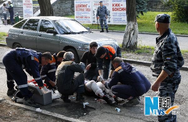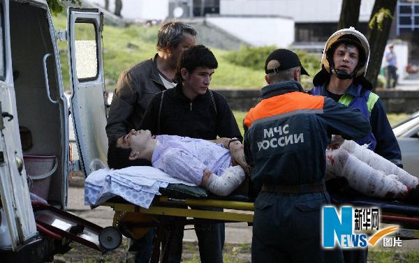 5月26日,救援人員在俄羅斯南部城市斯塔夫羅波爾的爆炸現場救助傷員。當日,斯塔夫羅波爾市中心發生爆炸事件,共造成6人死亡,約40人不同程度受傷。斯塔夫羅波爾護法機關的一名知情人士說,是一輛汽車發生了爆炸,不排除是一次恐怖襲擊。新華社/法新
