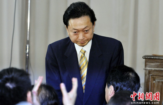 日本首相鳩山由紀夫宣布辭職,向大家鞠躬。