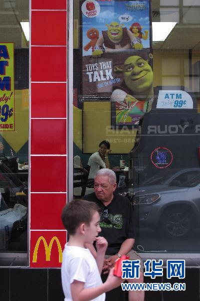 6月4日,市民在美國紐約的一家麥當勞連鎖店門前用餐。美國快餐業巨頭麥當勞公司當天宣布召回至少1330萬個印有《怪物史萊克4》圖案的玻璃杯。這些玻璃杯表面可能含有對人體有害的重金屬鎘。新華社發(吳凱翔攝)