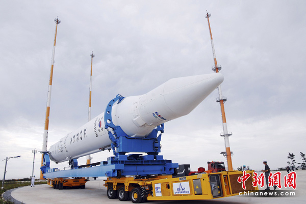 韓國(guó)首枚運(yùn)載火箭“羅老”號(hào)6月9日將再次發(fā)射升空。羅老號(hào)曾于去年8月25日第一次發(fā)射升空,但由于衛(wèi)星保護(hù)整流罩未能分離,最終未能進(jìn)入正常軌道。圖為6月7日,韓國(guó)“羅老”號(hào)運(yùn)載火箭運(yùn)往全羅南道羅老航天中心。