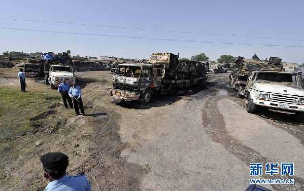 資料圖片:6月9日,在巴基斯坦首都伊斯蘭堡附近,巴基斯坦警察在被毀的北約車輛附近警戒。由約50輛油料和物資運輸車組成的北約車隊8日深夜在巴基斯坦首都伊斯蘭堡附近遭到不明身份武裝分子襲擊,造成至少8人死亡、6人受傷,30多輛車被焚毀。 新華社/法新