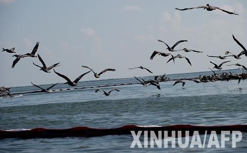 6月10日,在美國路易斯安那州的格蘭德艾爾,鵜鶘在墨西哥灣海面的隔油帶上飛翔。美國專家10日公布的初步調(diào)查結(jié)果顯示,在6月3日英國石油公司實(shí)施“切管蓋帽”工程之前,估計(jì)每天有2萬至4萬桶原油泄漏到墨西哥灣,大大高于此前的估計(jì)。新華社/法新