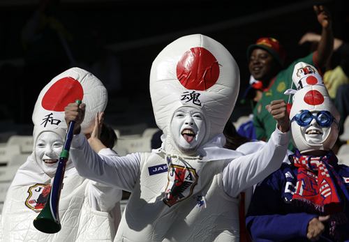 據臺灣“東森新聞網”22日報道,南非世界杯開幕后小組賽如火如荼地進行,除了場上拼搶的各國球員,為球員們加油助威的各國女球迷無疑也成為賽場邊一道吸引人眼球的風景線。不過,除了網絡走紅的美女球迷,更夸張的是日本裝扮奇特的女球迷,活像一個個保齡球瓶,又像“安全套”。