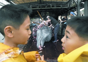 2009年6月21日,東京東南部,兩名日本兒童正在觀看捕鯨者處理新捕到的一頭鯨。