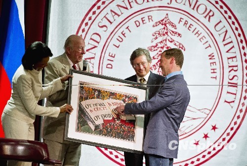 當地時間6月23日,正在美國硅谷考察高科技公司的俄羅斯總統梅德韋杰夫在斯坦福大學發表演講,希望以美國硅谷為模板,在莫斯科郊外打造“俄國硅谷”。圖為美國前國務卿賴斯(左一),舒爾茨(左二)向梅德韋杰夫贈送1921年的前蘇聯海報復制品。 中新社發 陳鋼 攝