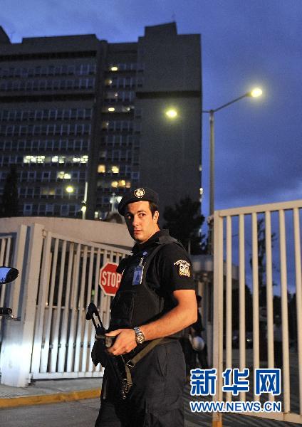6月24日,警察在希臘首都雅典的希臘公民保護部大樓外警戒。希臘公民保護部大樓當日傍晚發生爆炸,造成1人死亡。 新華社/法新