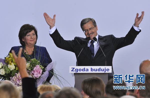 7月4日,波蘭代總統、眾議院議長、執政黨公民綱領黨候選人布羅尼斯瓦夫·科莫羅夫斯基(右)在首都華沙競選總部向支持者致意。波蘭多家媒體4日晚公布的投票站出口民調顯示,在當天舉行的波蘭總統選舉第二輪投票中,科莫羅夫斯基擊敗反對黨法律與公正黨主席、已故總統萊赫·卡欽斯基的孿生哥哥雅羅斯瓦夫·卡欽斯基,當選波蘭總統。新華社記者武巍攝
