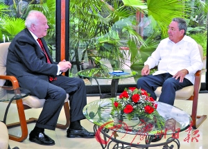 7日,古巴領(lǐng)導(dǎo)人勞爾·卡斯特羅(右)與到訪的西班牙外長(zhǎng)莫拉蒂諾舉行會(huì)談。