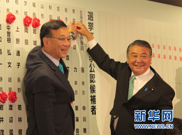 7月11日,在日本首都東京自民黨競選總部,自民黨總裁谷垣禎一(左)和干事長大島理森向本黨已當(dāng)選的參議院議員名單上貼紅花。新華社記者劉華攝