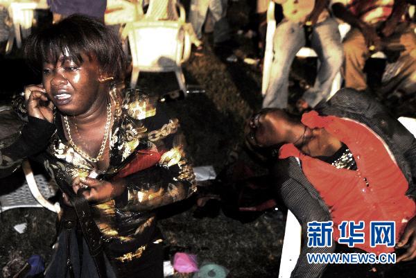 7月11日,在烏干達首都坎帕拉的一家埃塞俄比亞餐館爆炸現場,一名婦女坐在一名遇難者旁。 新華社/美聯