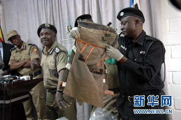 7月13日,烏干達警察在坎帕拉展示剛剛發(fā)現(xiàn)并且尚未引爆的自殺式炸彈腰帶。新華社發(fā)(薩繆爾·埃加度攝)