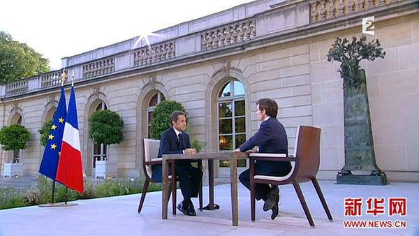 7月12日,法國(guó)總統(tǒng)薩科齊(左)在巴黎愛(ài)麗舍宮就政治獻(xiàn)金丑聞和政府改組接受法國(guó)電視二臺(tái)的專訪(電視截圖)。