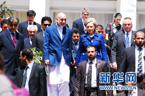 7月20日,在阿富汗首都喀布爾,阿富汗總統卡爾扎伊(中左)和美國國務卿希拉里·克林頓(中右)出席阿富汗問題國際會議開幕式。新華社發(薩羅什攝)