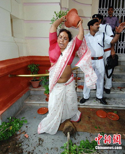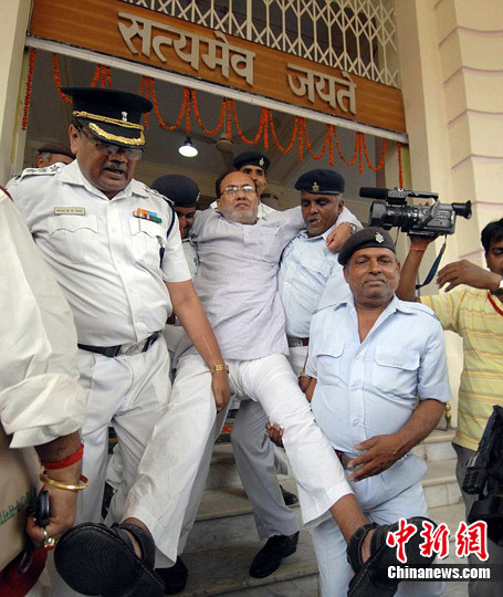日前,印度比哈爾邦議會的武斗丑聞逐日升溫,執(zhí)政派與反對派議員拳腳混戰(zhàn)持續(xù)數(shù)天后,67名議員21日由于“動武”而遭到停職。這一決定宣布后,反對派女議員基約蒂·辛格抓起議會大廳門口裝飾用的幾個大花盆扔向安保人員以發(fā)泄她的不滿,并再度引起騷動。三名安保人員只好將基約蒂·辛格拖走,其余被停職的66名反對派議員也逐一被安保人員拖走。