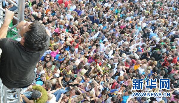 7月24日,在德國西部杜伊斯堡,人們試圖爬上欄桿躲避擁擠。當日,杜伊斯堡舉行“愛的大游行”電子音樂狂歡節時發生踩踏事件。新華社/法新
