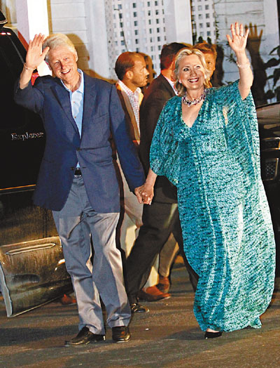 到了前晚 11時(shí),希拉里終于出現(xiàn)了。兩夫婦手挽手,出席晚宴彩排,完畢后返回酒店時(shí),不禁露出燦爛笑容,向圍觀的群眾揮手。