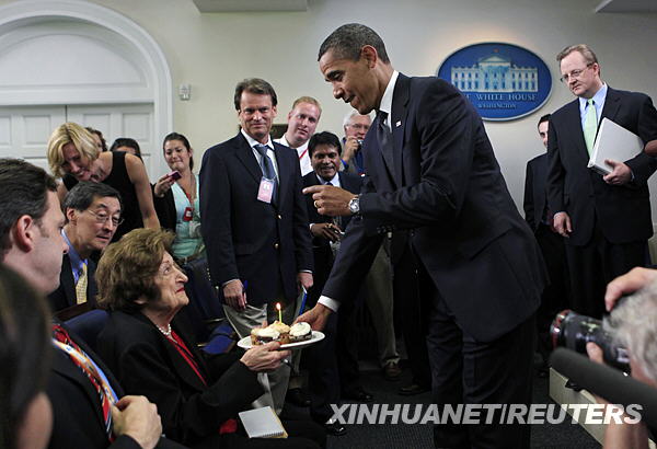 8月4日,在華盛頓白宮,美國總統奧巴馬向白宮專欄作家海倫·托馬斯贈送蛋糕,慶祝海倫89歲生日。新華社/路透