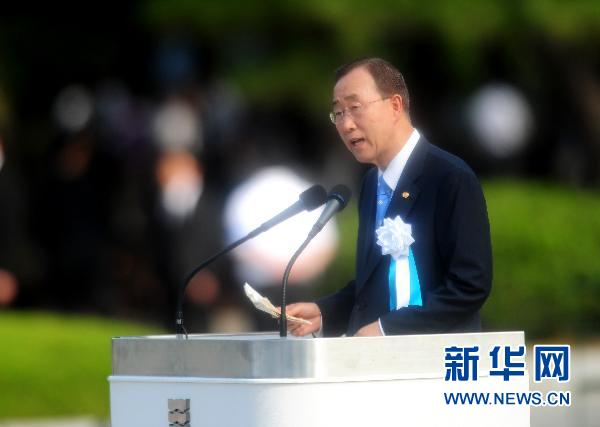 8月6日,在日本廣島和平紀念公園,聯合國秘書長潘基文在廣島遭受原子彈轟炸65周年紀念儀式上致辭。當天,日本舉行廣島原子彈爆炸死難者悼念儀式暨和平祈愿儀式,悼念原子彈轟炸死難者,祈禱世界和平。 新華社記者 季春鵬 攝