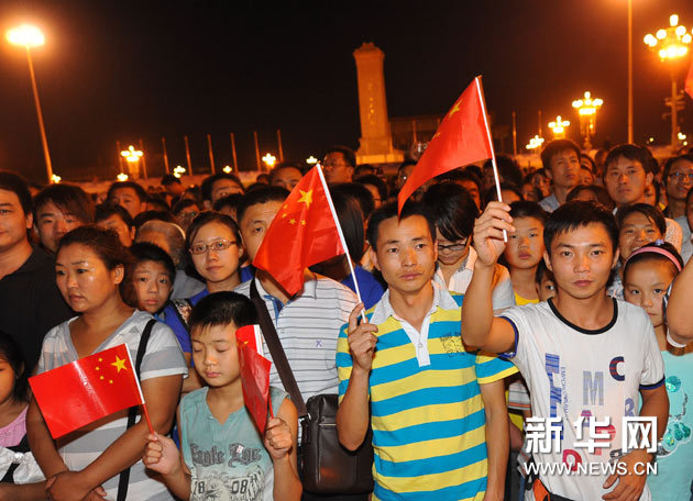8月15日,來自全國各地的群眾在天安門廣場等候觀看升旗和下半旗儀式。為表達全國各族人民對甘肅舟曲特大山洪泥石流遇難同胞的深切哀悼,國務院決定,2010年8月15日舉行全國哀悼活動,全國和駐外使領館下半旗志哀,停止公共娛樂活動。新華社記者羅曉光攝