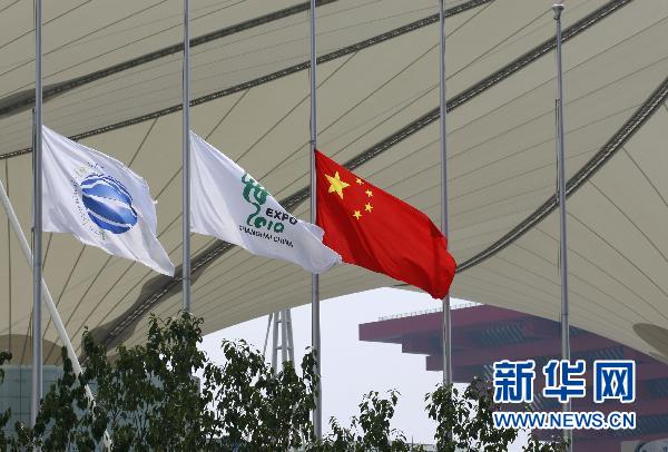 8月15日,世博園區下半旗向舟曲特大山洪泥石流遇難同胞志哀。當日,上海世博園區停止所有公共娛樂活動,取消當日園區所有文化演藝活動,停止播放開園音樂和園區背景音樂,并下半旗,向舟曲特大山洪泥石流遇難同胞志哀。新華社記者 裴鑫 攝